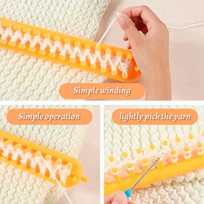 - Χρήση: Για να χρησιμοποιήσετε το Knitewise, τοποθετήστε το νήμα πλεξίματος στη συσκευή και κάντε έναν κόμπο. Στη συνέχεια, τυλίξτε τη μάλλινη κλωστή γύρω από τη συσκευή. Χρησιμοποιήστε τον γάντζο αφαίρεσης για να βοηθήσετε στην αφαίρεση του πλεκτού από το αξεσουάρ.