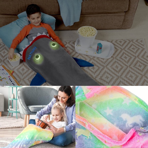 Το μαλακό, υψηλής ποιότητας φανελένιο φλις κρατάει τα παιδιά ζεστά ενώ χαλαρώνουν μετά το σχολείο ή χαλαρώνουν για τη νύχτα. Είναι ιδανικό για να χουχουλιάζουν στον καναπέ βλέποντας κινούμενα σχέδια ή για να μένουν ζεστά τις κρύες νύχτες. Τα παιδιά σας θα χαχανίζουν από χαρά καθώς θα κουρνιάζουν είτε με την ουρά καρχαρία είτε με την ουρά γοργόνας.