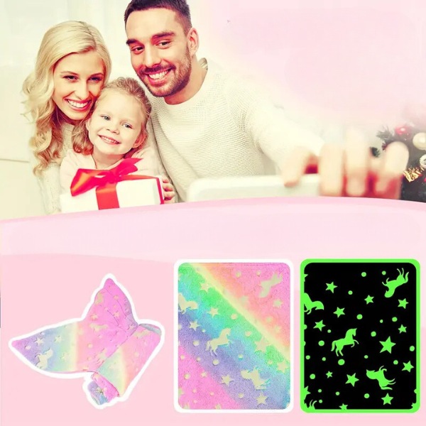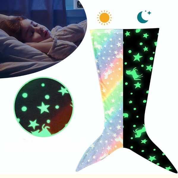 Η κουβέρτα MERMAIDREAM λάμπει στο σκοτάδι, παρέχοντας ένα ηρεμιστικό φως για να απαλύνει τους νυχτερινούς φόβους. Απλά εκθέστε την στο φως της ημέρας για 20 λεπτά και θα λάμπει απαλά όλη τη νύχτα. Επιλέξτε το σχέδιο με ουρά καρχαρία ή ουρά γοργόνας για πρόσθετη μαγεία καθώς το παιδί σας κοιμάται.