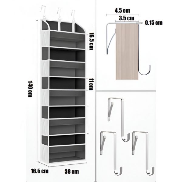 Εξοπλισμένος με 3 ρυθμιζόμενα μεταλλικά γάντζους, αυτός ο οργανωτής ταιριάζει εύκολα σε πόρτες μέχρι 4 εκατοστά πάχος.