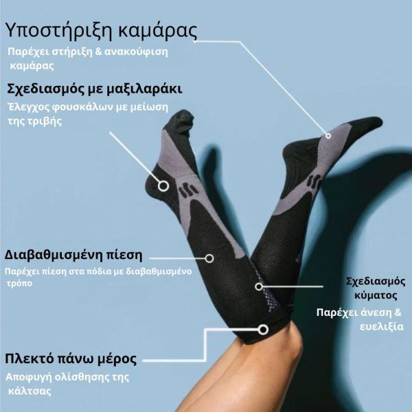 Αυτές οι κάλτσες συμβάλλουν στη βελτίωση της ροής του αίματος, πράγμα που σημαίνει λιγότερη κόπωση και περισσότερη ενέργεια για την ημέρα σας. Ιδανικές για πολλές ώρες στα πόδια σας ή για έντονη σωματική δραστηριότητα.